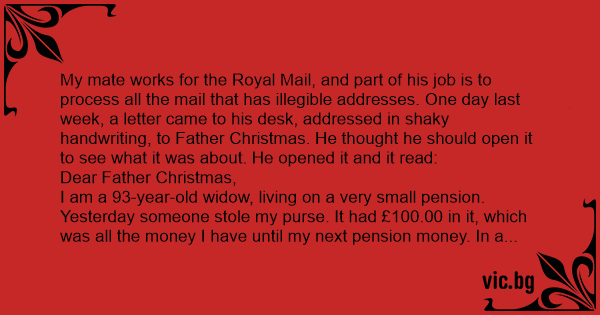 My mate was touched so he showed the letter to all of the other workers. Each of them dug into his wallet and came up with a few pounds. By the time he made the rounds, he had collected £96.00, which they put into an envelope and delivered in the post the next day to the woman. He told me all of the workers felt a warm glow for the kind thing they had done. Then a few days ago, another letter came from the old lady, to Father Christmas again. All of the workers gathered around while the letter was opened. It read: