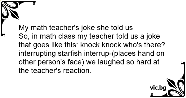 So, in math class my teacher told us a joke that goes like this: knock knock who's there? interrupting starfish interrup-(places hand on other person's face) we laughed so hard at the teacher's reaction.