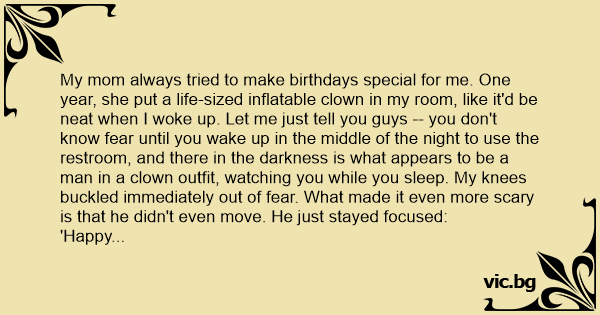 My mom always tried to make birthdays special for me. One year, she put a life-sized inflatable clown in my room, like it'd be neat when I woke up. Let me just tell you guys -- you don't know fear until you wake up in the middle of the night to use the restroom, and there in the darkness is what appears to be a man in a clown outfit, watching you while you sleep. My knees buckled immediately out of fear. What made it even more scary is that he didn't even move. He just stayed focused: