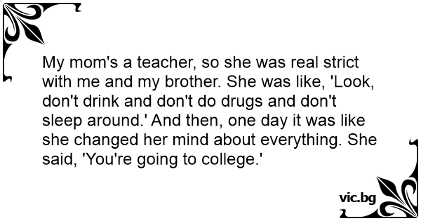 My mom's a teacher, so she was real strict with me and my brother. She was like, 'Look, don't drink and don't do drugs and don't sleep around.' And then, one day it was like she changed her mind about everything. She said, 'You're going to college.'