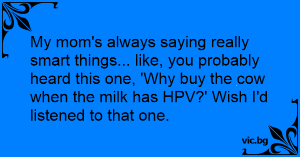 My mom's always saying really smart things... like, you probably heard this one, 'Why buy the соw when the milk has HPV?' Wish I'd listened to that one.