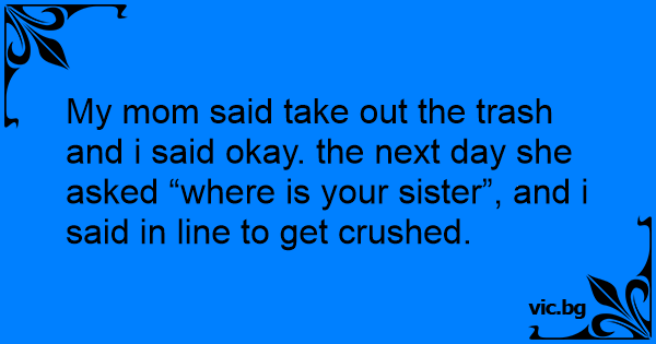 My mom said take out the trash and i said okay. the next day she asked “where is your sister”, and i said in line to get crushed.