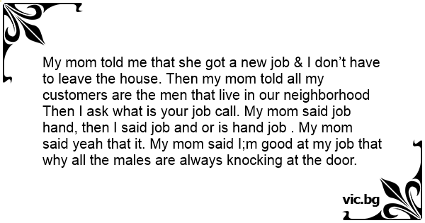 My mom told me that she got a new job & I don’t have to leave the house. Then my mom told all my customers are the men that live in our neighborhood Then I ask what is your job call. My mom said job hand, then I said job and or is hand job . My mom said yeah that it. My mom said I;m good at my job that why all the males are always knocking at the door.