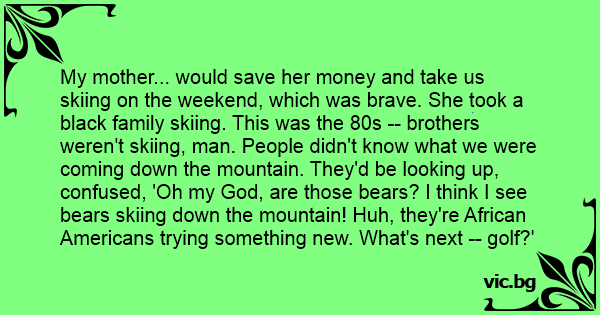 My mother... would save her money and take us skiing on the weekend, which was brave. She took a black family skiing. This was the 80s -- brothers weren't skiing, man. People didn't know what we were coming down the mountain. They'd be looking up, confused, 'Oh my God, are those bears? I think I see bears skiing down the mountain! Huh, they're African Americans trying something new. What's next -- golf?'