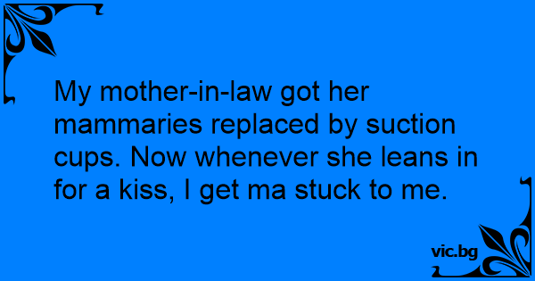 My mother-in-law got her mammaries replaced by suction cups. Now whenever she leans in for a kiss, I get ma stuck to me.