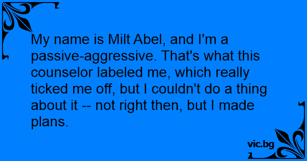 My name is Milt Abel, and I'm a passive-aggressive. That's what this counselor labeled me, which really ticked me off, but I couldn't do a thing about it -- not right then, but I made plans.