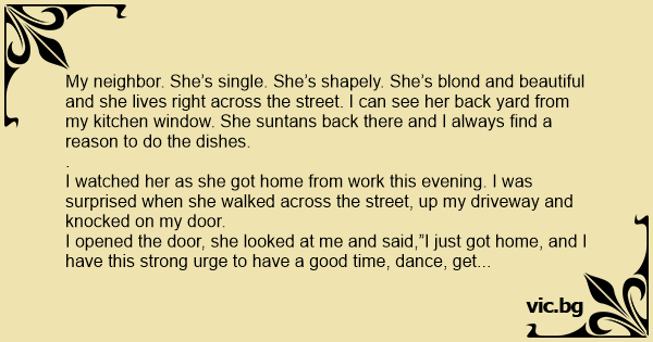 My neighbor. She’s single. She’s shapely. She’s blond and beautiful and she lives right across the street. I can see her back yard from my kitchen window. She suntans back there and I always find a reason to do the dishes.