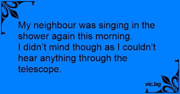 My neighbour was singing in the shower again this morning.<br />I didn’t mind though as I couldn’t hear anything through the telescope.