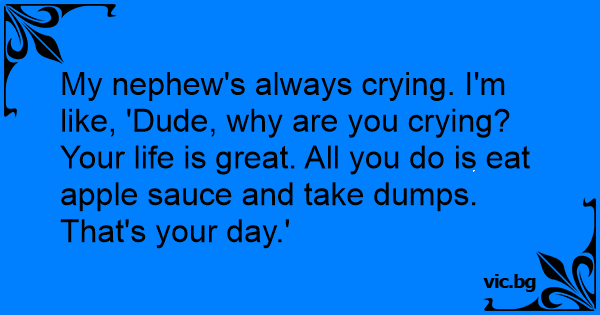 My nephew's always crying. I'm like, 'Dude, why are you crying? Your life is great. All you do is eat apple sauce and take dumps. That's your day.'
