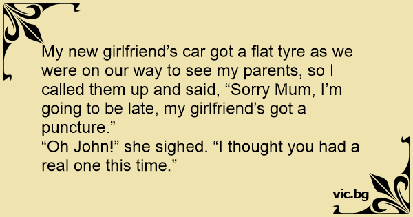 My new girlfriend’s car got a flat tyre as we were on our way to see my parents, so I called them up and said, “Sorry Mum, I’m going to be late, my girlfriend’s got a puncture.”