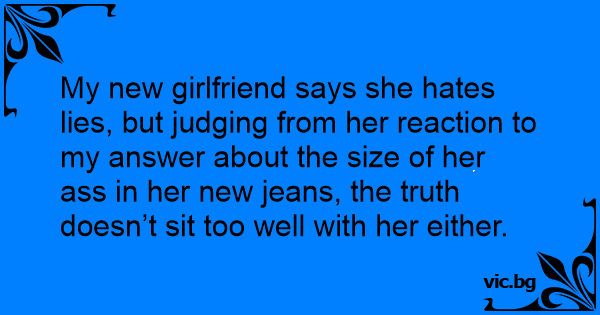 My new girlfriend says she hates lies, but judging from her reaction to my answer about the size of her аss in her new jeans, the truth doesn’t sit too well with her either.