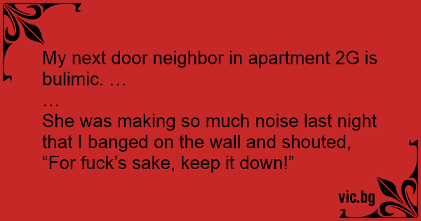She was making so much noise last night that I banged on the wall and shouted, “For fuск’s sake, keep it down!”