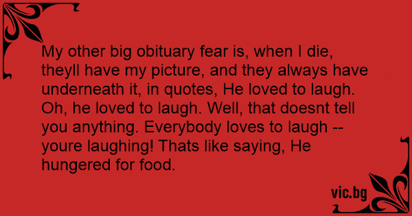 My other big obituary fear is, when I die, theyll have my picture, and they always have underneath it, in quotes, He loved to laugh. Oh, he loved to laugh. Well, that doesnt tell you anything. Everybody loves to laugh -- youre laughing! Thats like saying, He hungered for food.