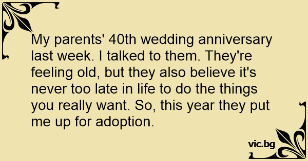 My parents' 40th wedding anniversary last week. I talked to them. They're feeling old, but they also believe it's never too late in life to do the things you really want. So, this year they put me up for adoption.
