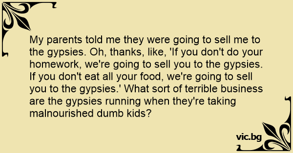 My parents told me they were going to sell me to the gypsies. Oh, thanks, like, 'If you don't do your homework, we're going to sell you to the gypsies. If you don't eat all your food, we're going to sell you to the gypsies.' What sort of terrible business are the gypsies running when they're taking malnourished dumb kids?