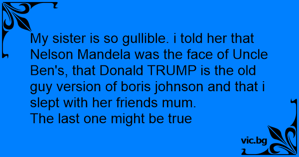 My sister is so gullible. i told her that Nelson Mandela was the face of Uncle Ben's, that Donald TRUMP is the old guy version of boris johnson and that i slept with her friends mum.