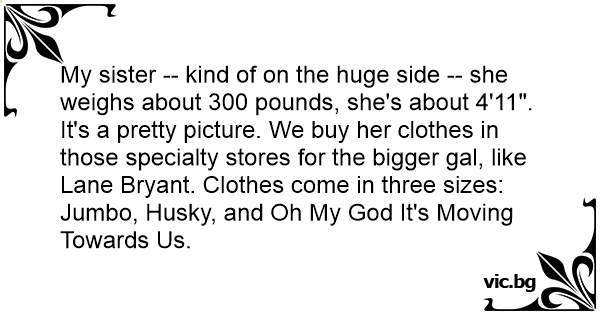 My sister -- kind of on the huge side -- she weighs about 300 pounds, she's about 4'11". It's a pretty picture. We buy her clothes in those specialty stores for the вiggеr gal, like Lane Bryant. Clothes come in three sizes: Jumbo, Husky, and Oh My God It's Moving Towards Us.