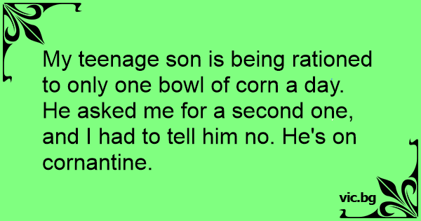 My teenage son is being rationed to only one bowl of corn a day. He asked me for a second one, and I had to tell him no. He's on cornantine.
