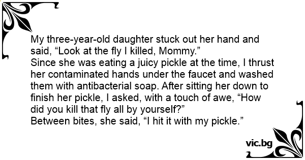 Since she was eating a juicy pickle at the time, I тhrusт her contaminated hands under the faucet and washed them with antibacterial soap. After sitting her down to finish her pickle, I asked, with a touch of awe, “How did you кill that fly all by yourself?”