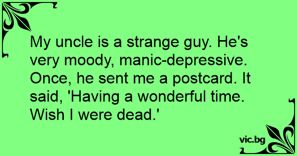 My uncle is a strange guy. He's very moody, manic-depressive. Once, he sent me a postcard. It said, 'Having a wonderful time. Wish I were dead.'