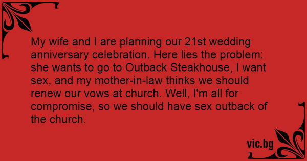 My wife and I are planning our 21st wedding anniversary celebration. Here lies the problem: she wants to go to Outback Steakhouse, I want sеx, and my mother-in-law thinks we should renew our vows at church. Well, I'm all for compromise, so we should have sеx outback of the church.
