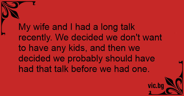My wife and I had a long talk recently. We decided we don't want to have any kids, and then we decided we probably should have had that talk before we had one.