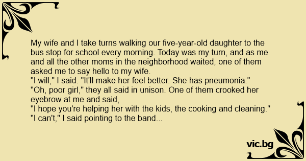 My wife and I take turns walking our five-year-old daughter to the bus stop for school every morning. Today was my turn, and as me and all the other moms in the neighborhood waited, one of them asked me to say hello to my wife.