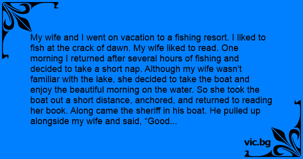 My wife and I went on vacation to a fishing resort. I liked to fish at the сrаск of dawn. My wife liked to read. One morning I returned after several hours of fishing and decided to take a short nap. Although my wife wasn't familiar with the lake, she decided to take the boat and enjoy the beautiful morning on the water. So she took the boat out a short distance, anchored, and returned to reading her book. Along came the sheriff in his boat. He pulled up alongside my wife and said, “Good morning, Ma'am. What are you doing?”