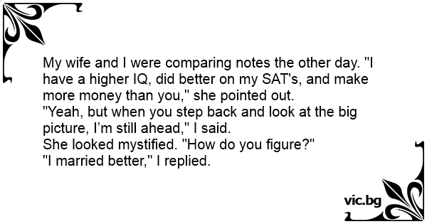 My wife and I were comparing notes the other day. "I have a higher IQ, did better on my SAT's, and make more money than you," she pointed out.