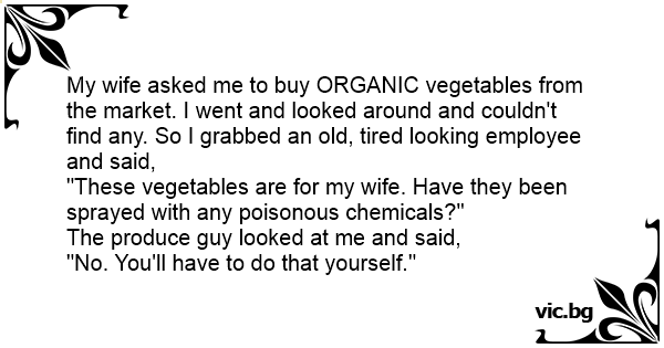 My wife asked me to buy ORGANIC vegetables from the market. I went and looked around and couldn't find any. So I grabbed an old, tired looking employee and said,