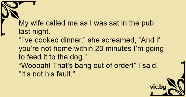 “I’ve cooked dinner,” she screamed, “And if you’re not home within 20 minutes I’m going to feed it to the dog.”
