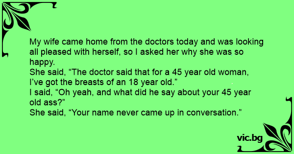 My wife came home from the doctors today and was looking all pleased with herself, so I asked her why she was so happy.