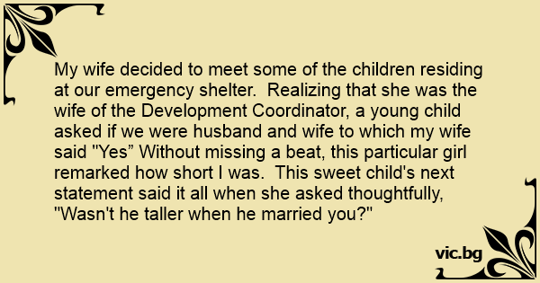 My wife decided to meet some of the children residing at our emergency shelter. Realizing that she was the wife of the Development Coordinator, a young child asked if we were husband and wife to which my wife said "Yes” Without missing a beat, this particular girl remarked how short I was. This sweet child's next statement said it all when she asked thoughtfully, "Wasn't he taller when he married you?"