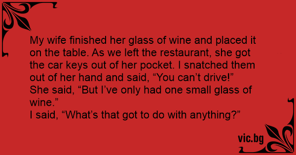 My wife finished her glass of wine and placed it on the table. As we left the restaurant, she got the car keys out of her pocket. I snatched them out of her hand and said, “You can’t drive!”