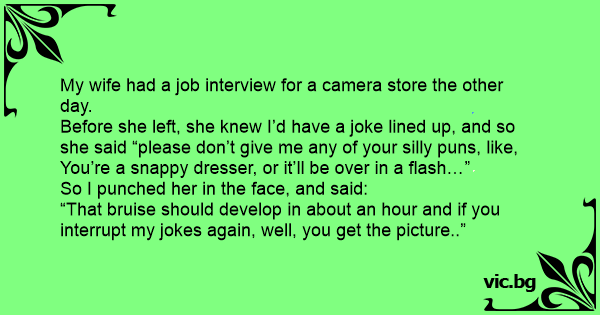 Before she left, she knew I’d have a joke lined up, and so she said “please don’t give me any of your silly puns, like, You’re a snappy dresser, or it’ll be over in a flash…”