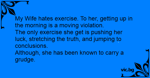 My Wife hates exercise. To her, getting up in the morning is a moving violation.