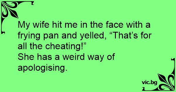 My wife hit me in the face with a frying pan and yelled, “That’s for all the cheating!”