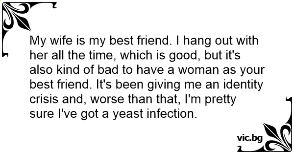 My wife is my best friend. I hang out with her all the time, which is good, but it's also kind of bad to have a woman as your best friend. It's been giving me an identity crisis and, worse than that, I'm pretty sure I've got a yeast infection.