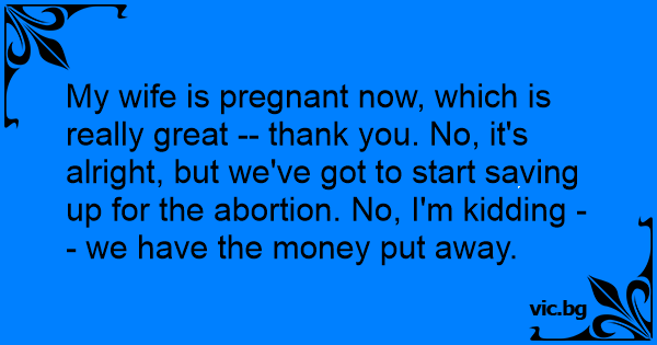 My wife is pregnant now, which is really great -- thank you. No, it's alright, but we've got to start saving up for the abortion. No, I'm kidding -- we have the money put away.