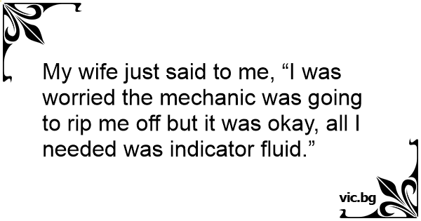 My wife just said to me, “I was worried the mechanic was going to rip me off but it was okay, all I needed was indicator fluid.”