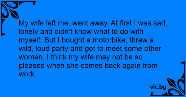 My wife left me, went away. At first I was sad, lonely and didn’t know what to do with myself. But I bought a motorbike, threw a wild, loud party and got to meet some other women. I think my wife may not be so pleased when she comes back again from work.