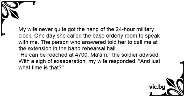 My wife never quite got the hang of the 24-hour military clock. One day she called the base orderly room to speak with me. The person who answered told her to call me at the extension in the band rehearsal hall.