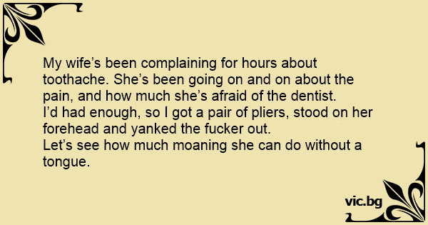 My wife’s been complaining for hours about toothache. She’s been going on and on about the pain, and how much she’s afraid of the dentist.