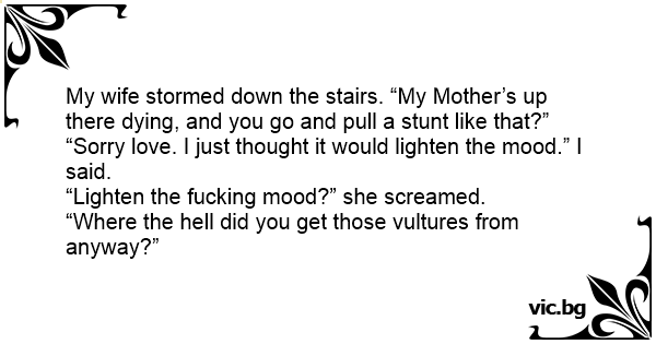 My wife stormed down the stairs. “My Mother’s up there dying, and you go and pull a stunt like that?”