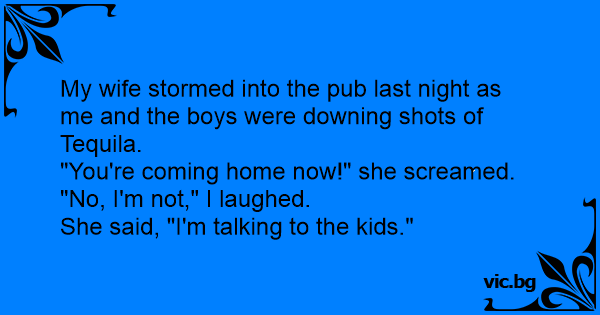 My wife stormed into the pub last night as me and the boys were downing shots of Tequila.