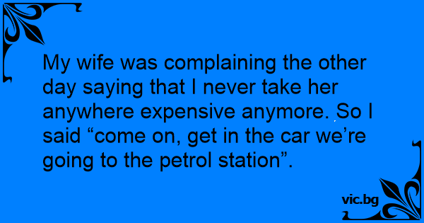 My wife was complaining the other day saying that I never take her anywhere expensive anymore. So I said “come on, get in the car we’re going to the petrol station”.