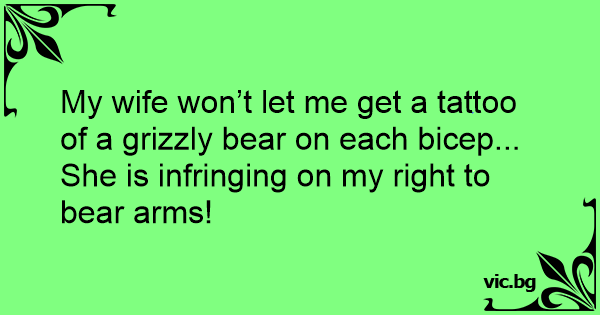 My wife won’t let me get a tattoo of a grizzly bear on each bicep... She is infringing on my right to bear arms!