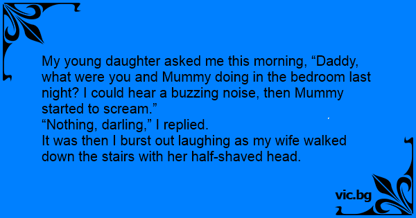 My young daughter asked me this morning, “Daddy, what were you and Mummy doing in the bedroom last night? I could hear a buzzing noise, then Mummy started to scream.”