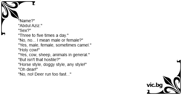 - NAME? - Muhjmatil Ahmed. - SEX? - Three times a week! - NO, I MEAN; MALE OR FEMALE? - Doesnt matter. Sometimes even with camel...
