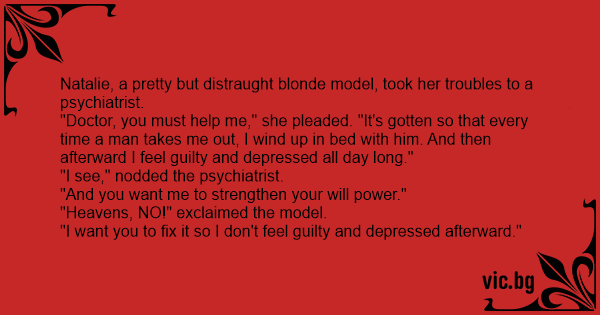 "Doctor, you must help me," she pleaded. "It's gotten so that every time a man takes me out, I wind up in bed with him. And then afterward I feel guilty and depressed all day long."